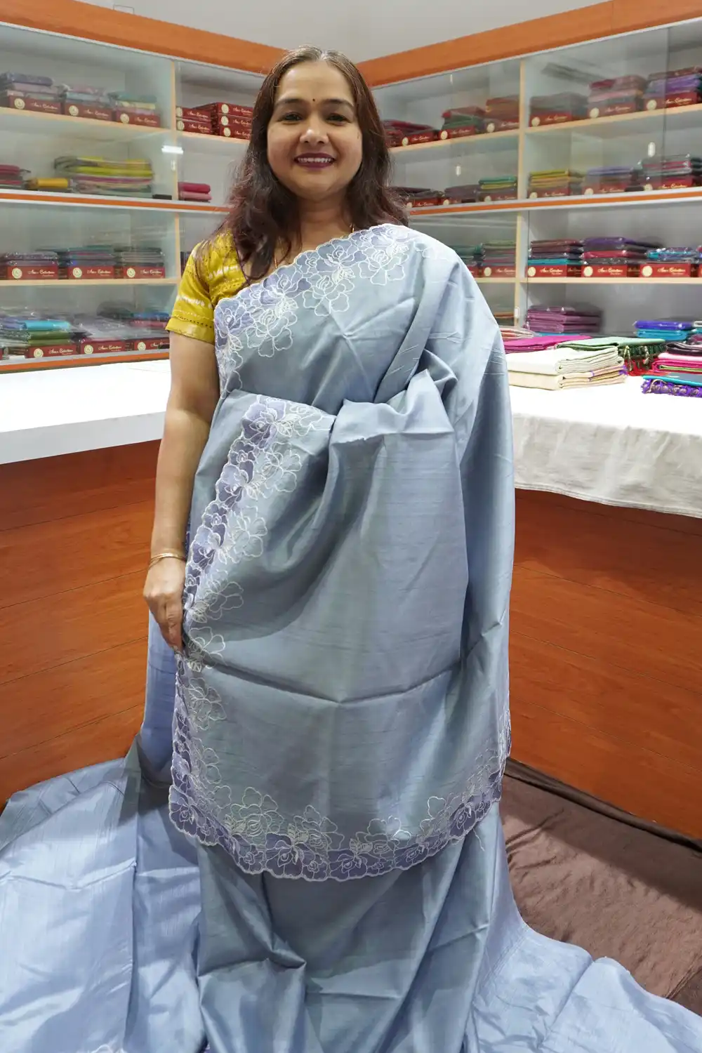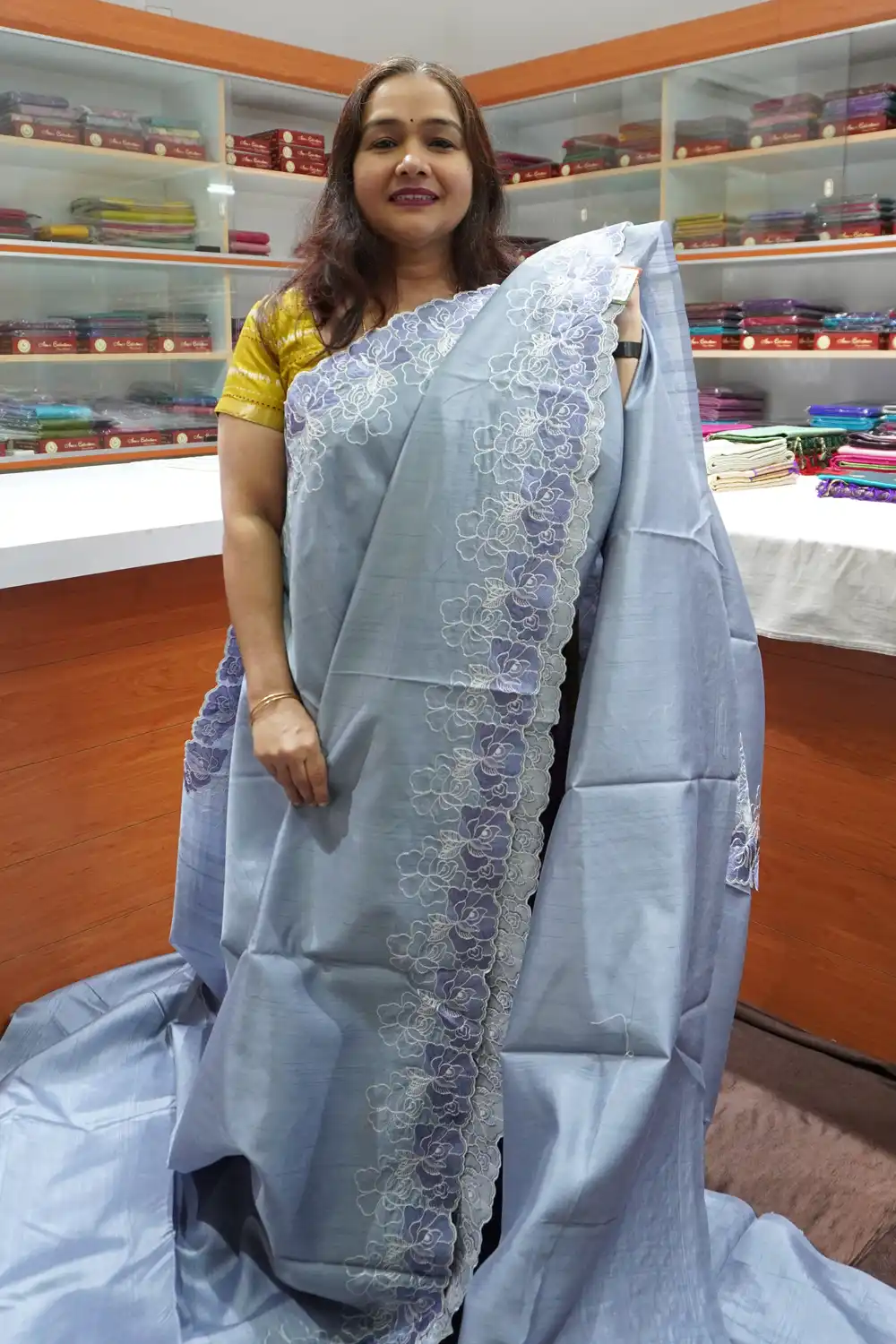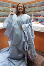 Delicately adorned with intricate embroidery, each saree reflects the skill of master artisans who bring artistry to life through fine detailing and elegant motifs. Whether it’s a festive celebration, wedding event, or special occasion, this saree adds a touch of sophistication to your ensemble.
