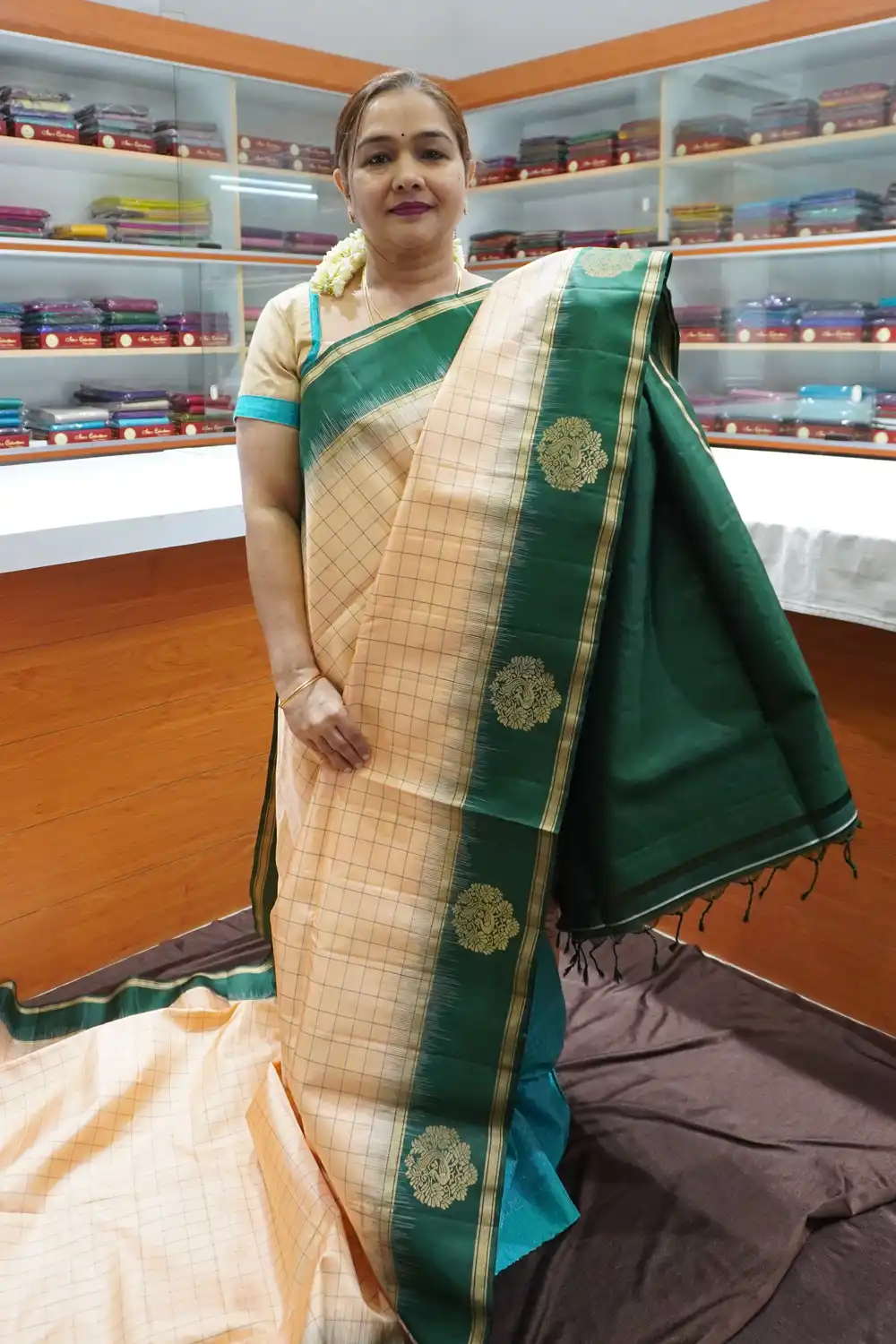 Light Peach & Bottle Green – PRSK208 – Pure Kanchipuram Soft Silk Saree