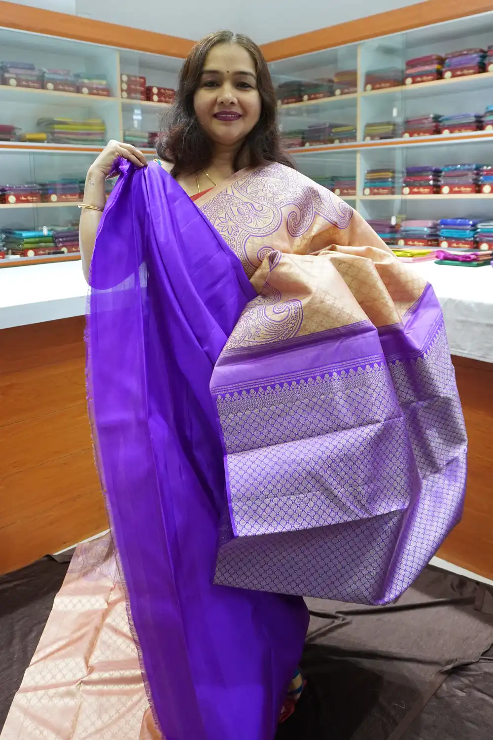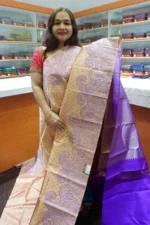 Exquisite Zari Work – Adorned with intricate motifs inspired by temples, florals, and royal heritage, each saree is woven with pure zari, enhancing its luxurious appeal.